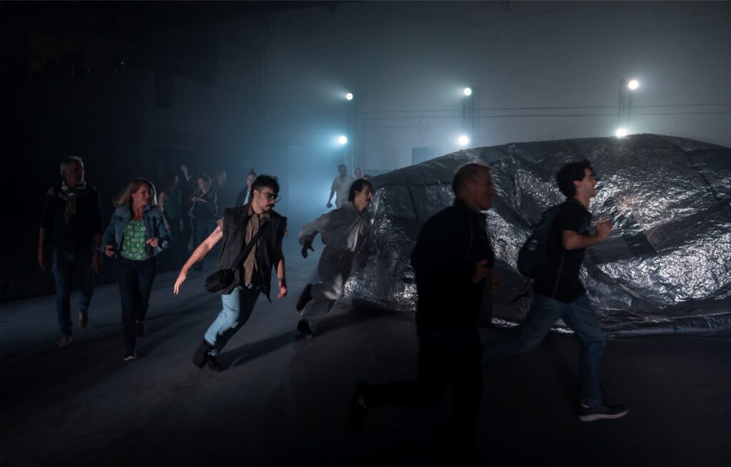 La escenografía inmersa en un ambiente industrial está compuesta por esa especie de meteoritos de aire, rocas inflables de diferentes dimensiones que el grupo de intérpretes manipula, y que introduce un imaginario intergaláctico. Un paisaje en el que la coreografía se despliega como una investigación científica que explora mundos extraterrestres.