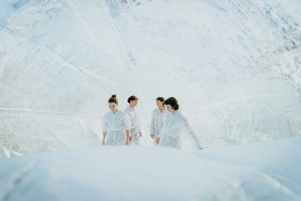 La obra inicia con una entrada que podríamos calificar como ‘misteriosa’, o al menos que puede generar cierta intriga. El grupo de intérpretes invita a cruzar por encima de una especie de bolsa tubular llena de aire, algo posible de realizar con su ayuda. Desde este pequeño gesto somos incluidos como parte de esa poética que comienza a crearse.