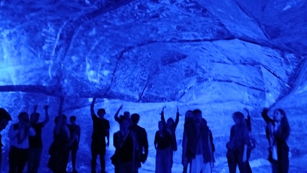 Lo grave se vuelca a la existencia, preocupante, difícil, una situación extrema. Puede aludir a un contexto duro. ¿Qué pasa entonces cuando hay participación activa y podemos ser parte de lo mismo? Cuando toda la grupalidad está adentro, en la misma historia, tal como el público se introduce en ese universo lunar, azul, como una gran ballena de paredes espejadas, donde el espejo en el que se puede ver reflejado el público es el otrx.